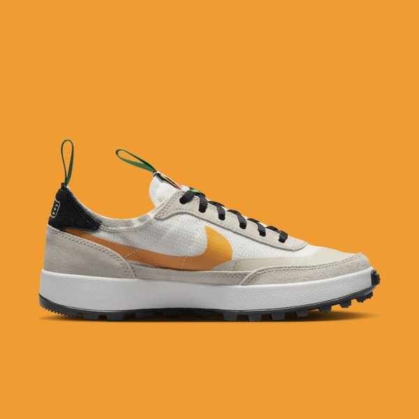Ein sauberes weißes Mesh wird von grauen Wildleder-Overlays überlagert, während ein sattes Schwarz die Laces und Fersenlaschen ausfüllt. Für mehr Farbe sorgen die Swooshes und Zuglaschen, die in Grün und Gelb gehalten sind. Ganz unten vervollständigen dann helle Zwischensohlen und schwarze Laufsohlen das Design des Tom Sachs x NikeCraft General Purpose Shoe.