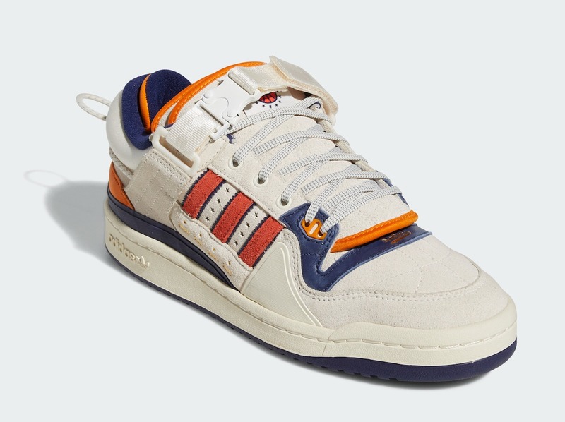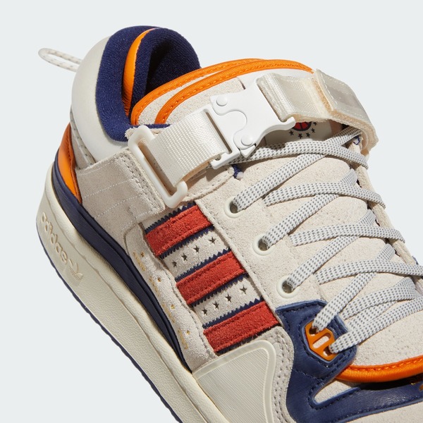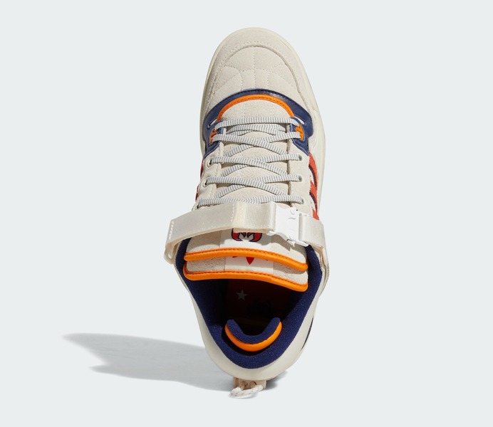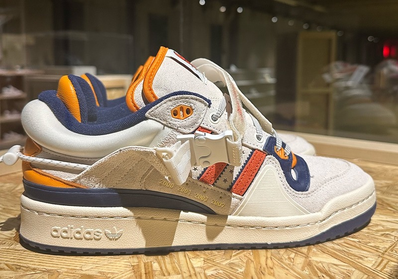 Der Bad Bunny x adidas Forum Buckle Low „Cangrejeros“ zeichnet sich durch eine Mischung aus Marine- und Orangetönen aus, um die geliebte Mannschaft zu repräsentieren, sowie durch ihr Logo und eine spezielle Stickerei mit den Worten „SANTRUCE“ und „CANGREJEROS“. Auf dem Mittelteil der Schuhe sind die Jahreszahlen der acht Meisterschaften des Teams auf einzigartige Weise eingearbeitet.