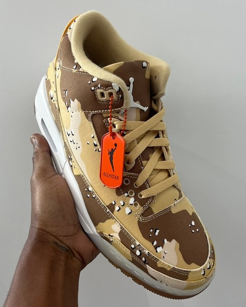 Der Air Jordan 3 "WNBA All-Star", der zum WNBA All-Star Game 2024 am 20. Juli in Phoenix erscheint, zeichnet sich durch ein Desert Camo-Muster auf dem Obermaterial aus, das zur Wüstenlandschaft der Stadt passt. Der Sneaker ist mit speziellen orangefarbenen Hangtags versehen, die das WNBA-Logo tragen.