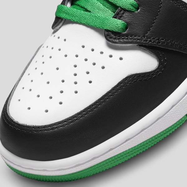 Weißes Leder bildet den Hintergrund für die schwarzen Overlays und Swooshes. Im Gegensatz zum OG-Blocking verfügt der Air Jordan 1 High OG „Celtics“ über eine schwarze Nylonzunge. Zuletzt erscheinen dann grüne Hits auf den Laces, Knöchellaschen und Fersen.