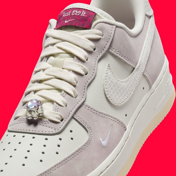 Nike und Jordan Brand feiern seit über einem Jahrzehnt konsequent das chinesische Neujahr. Das Jahr des Drachen im Jahr 2024 hat bereits mehrere Modelle inspiriert, wie den Air Jordan 1 Low OG und Air Jordan 38. Nun ist der Air Force 1 Low als Teil des „Jahr des Drachen“-Themas erschienen und weiß zu begeistern. Das Obermaterial in Hellgrau und Pastellrosa kombiniert Leder und weichen Wildleder. Sowohl der Swoosh als auch der Fersenbereich sind in einem ähnlichen Grauton gehalten und die Schuppenstruktur des Drachen ist erkennbar. Die Zunge trägt das „Just Do It“-Motiv, das von thematischen Elementen wie dem speziellen Einlegesohlen-Design, den Schnürsenkeln und der Fersenlasche ergänzt wird. Die weiße Zwischensohle und die halbtransparente, pink-gummifarbene Laufsohle runden das Design dann gekonnt ab.