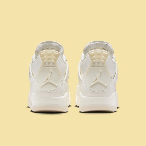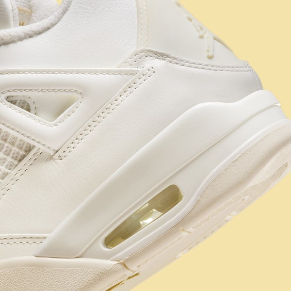 Der Air Jordan 4 "Metallic Gold" präsentiert uns ein Lederupper in einem cleanen "Sail", wobei der Farbton beinahe das gesamte Upper dominiert. Die Außensohlen sowie Fersenkappen wirken etwas dunkler, die viel wichtigeren Highlights finden sich aber ohnehin auf den Eyelets sowie Teilen der Brandings wieder. Dort macht sich nämlich ein edles, metallisches Gold bemerkbar, welches die gesamte Aufmerksamkeit auf sich zieht.