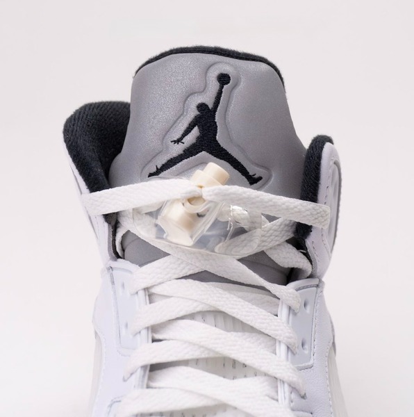 Diese Ausgabe des Air Jordan 5 greift auf ein cleanes Lederupper in Weiß zurück, wobei das ikonische Mesh an den Seiten in einem cremefarbenen Sail daherkommt. Die Zungen präsentieren ein reflektierendes, metallisches Silber, während ein tiefes Schwarz auf den Jumpman Logos, dem Innenfutter sowie den Lacelocks zum Einsatz kommt. Weiße Mittelsohlen werden darüber hinaus mit schwarz-weiß gesprenkelten Haizähnen verziert, wobei eine milchige, semi-transparente Außensohle den Sneaker perfekt abrundet.