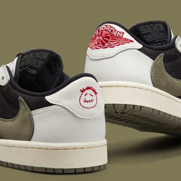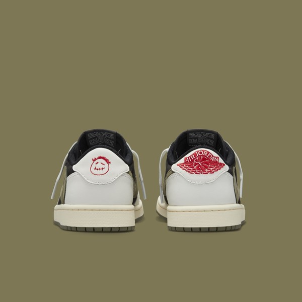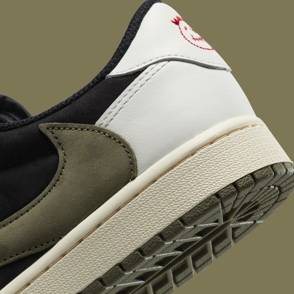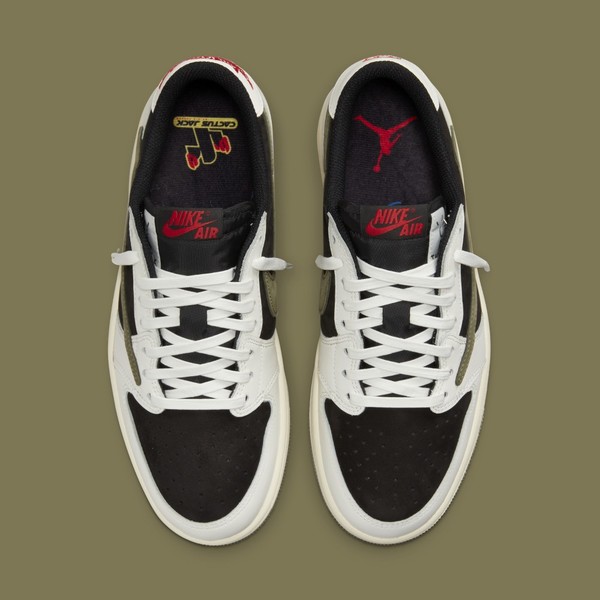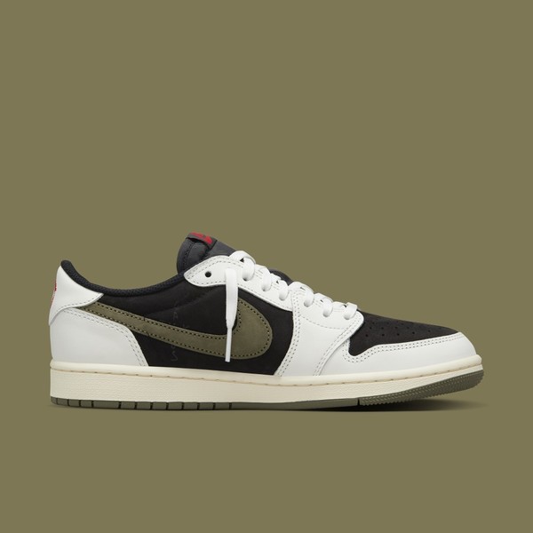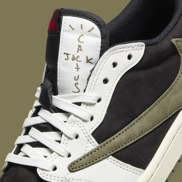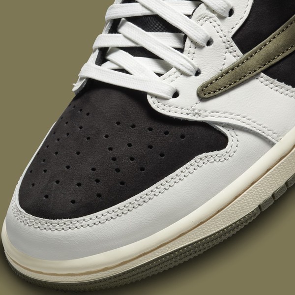 Man erwartet eine hochwertige Konstruktion aus Wildleder und Leder, wobei Ersteres die Basis bildet und in Schwarz gehalten ist. Anschließend soll helles Leder auf den Overlays und Swooshes des Travis Scott x Air Jordan 1 Low WMNS „Olive“ erscheinen. Der große umgekehrte Swoosh und die laces sollen im namensgebenden Olive Farbton gehalten sein.