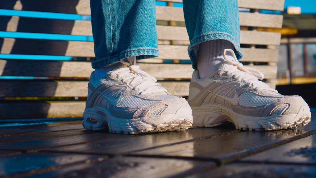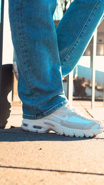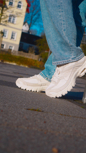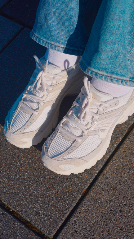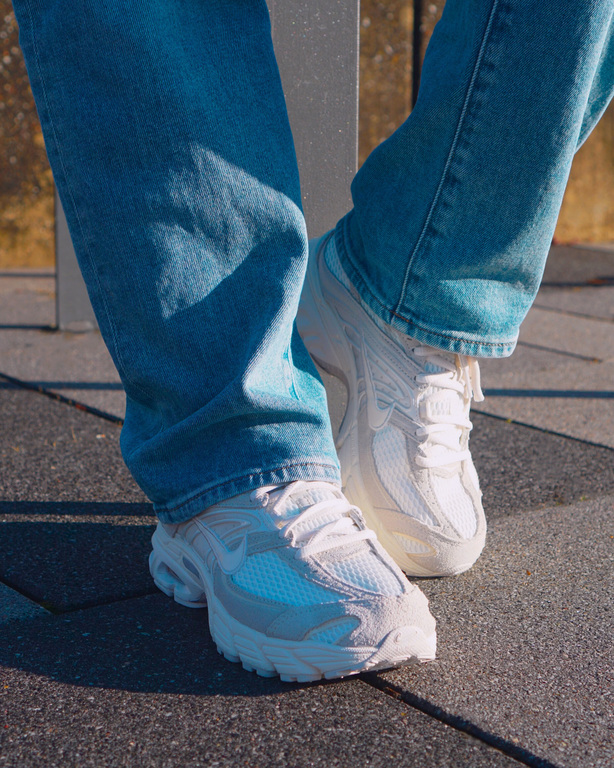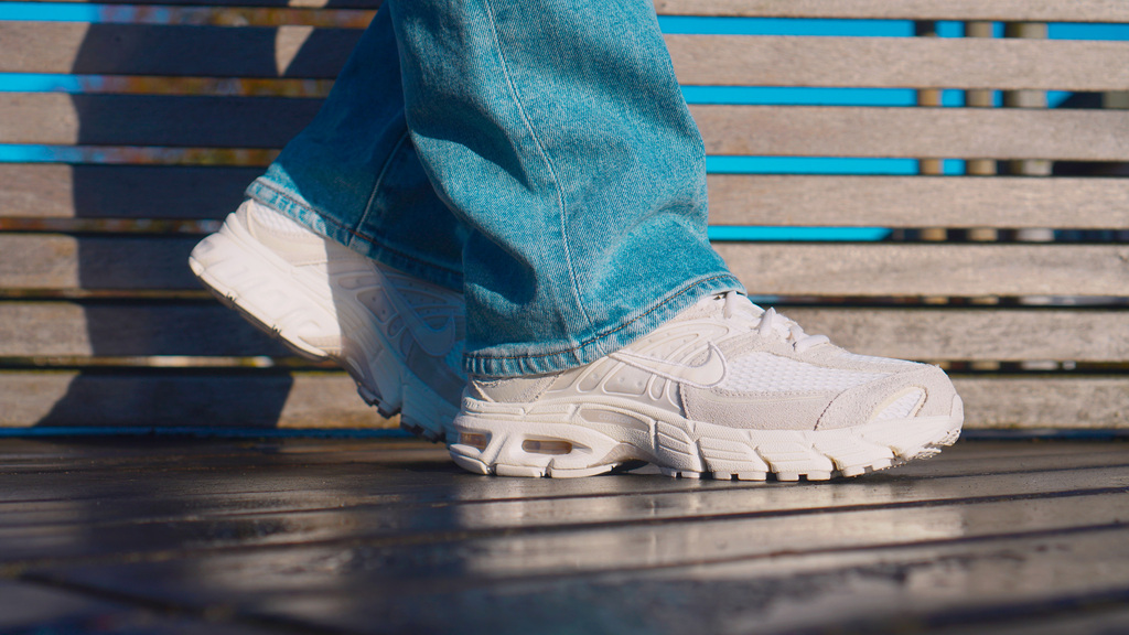 Das Obermaterial mixt atmungsaktives Mesh mit Leder- und Synthetik-Overlays, was nicht nur visuell an klassische Lauf-Ästhetik erinnert, sondern auch funktional überzeugt. Besonders auffällig sind die welligen Linien, die sich über das Upper ziehen – ein Designcode, der sofort Y2K-Vibes weckt. Dazu gesellen sich cleane Farbgebungen wie Sail, Pale Ivory und Phantom, die dem Schuh trotz technischer Basis eine fast schon elegante Zurückhaltung geben. Ein Highlight ist das sichtbare Max Air-Element in der Ferse, das nicht nur cushioning liefert, sondern auch optisch das Retro-Feeling unterstreicht.
