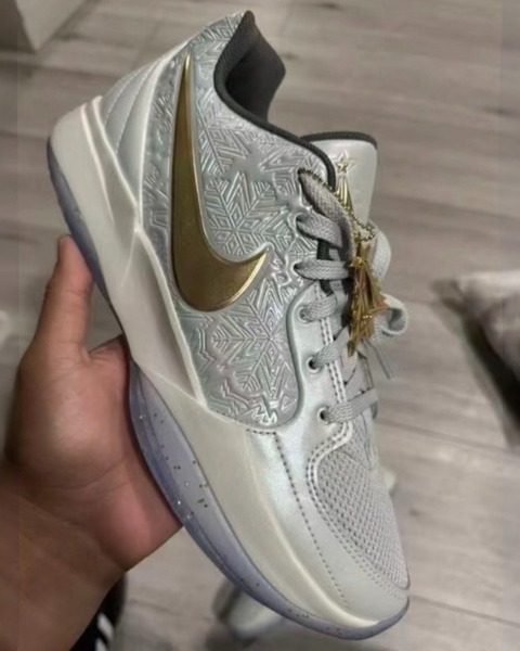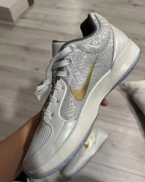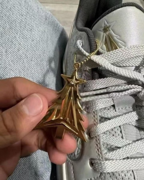 Der Nike Ja 2 "Christmas" präsentiert ein elegantes Obermaterial in Silber und Grau, verziert mit filigranen Schneeflockenmustern, die an ein Winterwunderland erinnern. Ein metallischer goldener Swoosh setzt einen luxuriösen Kontrast, während eine durchsichtige, eisige Außensohle mit Goldsprenkeln das winterliche Thema unterstreicht. Das Design wird durch einen speziellen Weihnachtsbaum-Anhänger abgerundet.