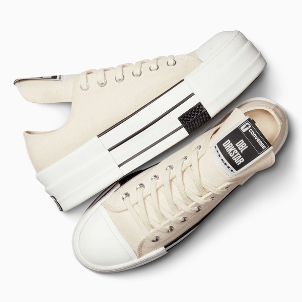 Beide Paare sind aus schwarzem bzw. naturfarbenem Canvas-Obermaterial mit kontrastierenden weißen bzw. farblich passenden Nähten. Die klassischen Converse All-Star-Logos befinden sich auf der Innenseite beider Paare. Auf der Zunge und auf einem der gummierten Fersenlogos befindet sich das DBL DRKSTAR"-Branding, auf dem anderen das traditionelle Converse-Branding. Beide Paare werden am 8. September veröffentlicht, wobei derzeit nur der Rick Owens x Converse DRKSHDW DBL DRKSTAR Low gelistet ist. Weitere Details gibt es im Converse Online Shop.