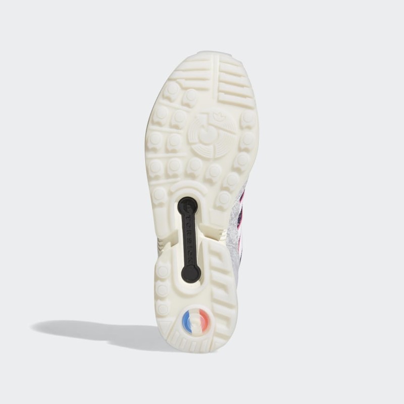 Der Sneaker verfügt über ein individuelles Jacquard Upper, das aus zwei Farben besteht.Das Obermaterial ist mit individuellen Schnürsenkeln, pinkfarbenem Three Stripe-Branding und einer Einlegesohle mit dem Schriftzug "La Marque Aux 3 Bandes" versehen, der französischen Übersetzung des klassischen adidas Slogans "The Brand with the Three Stripes".