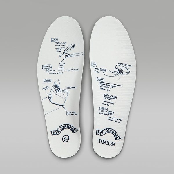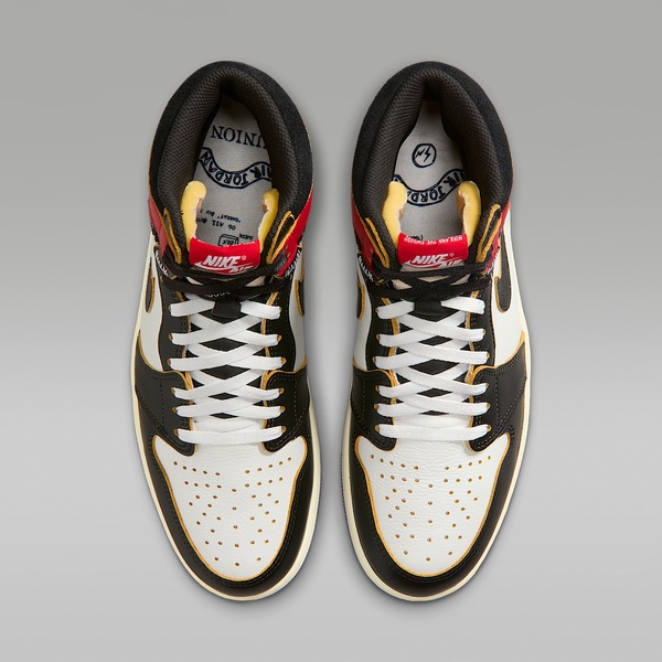 Das Upper besteht aus hochwertigem, getrommeltem Leder in klassischem Black/White/Varsity Red-Blocking. Die Ferse und Außensohle erscheinen in Fragment-typischem Sport Royal, inklusive Double-Lightning-Logo an der Seite. Union bringt seine charakteristischen Details ein: sichtbare Nähte am Collar, das UN/LA-Tag unter dem Wings-Logo sowie ein bewusst vintage-inspiriertes Finish.