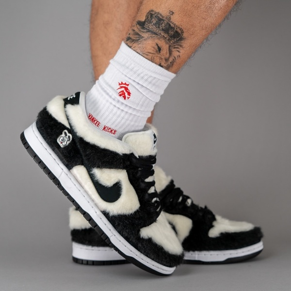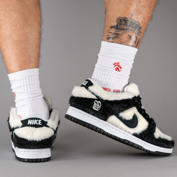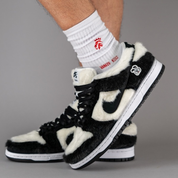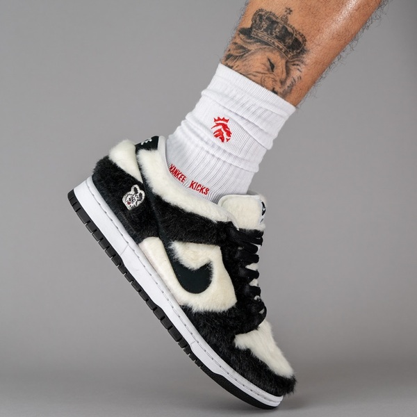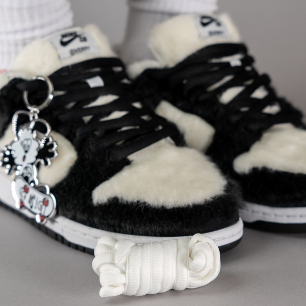 Der Nike SB Dunk Low "Vick" (FN6039-100) ist mit luxuriösen Materialien wie Kunstfell, Wildleder und Swoosh-Logo aus Leder ausgestattet, die sein strukturiertes und stilvolles Erscheinungsbild unterstreichen. Er ist mit markanten Branding-Elementen wie "Nike SB" und "Verdy" auf der Zunge und einer optisch ansprechenden, zweifarbigen Gummilaufsohle ausgestattet. Dieses Modell fördert die Personalisierung mit seinen zusätzlichen Schnürsenkeln, was seine Attraktivität unter Sneakerheads erhöht.