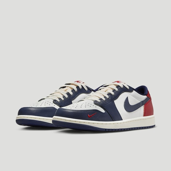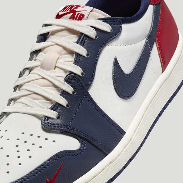 Das Upper des Sneakers besteht aus weißem Premium-Leder, begleitet von roten, gecrackten Overlays und marineblauen, safari-texturierten Swooshes. Ein kleiner marineblauer Swoosh ist auf der seitlichen Paneelen zu sehen, und das Bison-Logo ist auf die Einlegesohle gestanzt. Dieser Air Jordan 1 hat auch ein Innenfutter aus gestepptem Satin, während das Nike Air-Branding die Zunge ziert. Schließlich ruht diese auffällige Iteration des Air Jordan auf einer „Sail“-Mittelsohle und einer hellen Gummilaufsohle, um den Look zu vervollständigen. Leider wird dieser exklusive Spieler nicht in den Handel kommen - aber er ist es wert, aus der Ferne bewundert zu werden.
