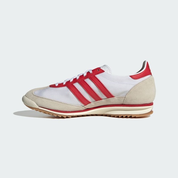 The first edition is the adidas SL 72 "75th Anniversary", dropping on 16 August 2024. This limited edition sneaker features a classic white nylon base with cream-coloured suede overlays, complemented by bold red leather accents and gold brand logos on the heels. These details pay tribute to adidas' rich past.
