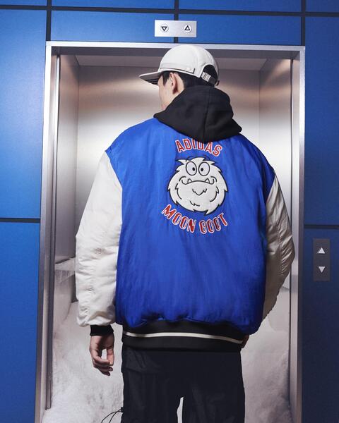 adidas x Moon Boot Collegiate Jacket: This oversized American collegiate-style bomber jacket combines bold graphic details and an integrated snow skirt at the waist. The design is reminiscent of classic ski fashion.