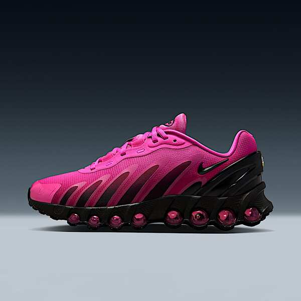 The ‘Green Strike’ colourway attracts maximum attention with its aggressive colour gradient from neon green to black. The breathable mesh upper is complemented by synthetic overlays and reflective accents that emphasise the aerodynamic look of the sneaker. The large Dynamic Air unit in the midsole is not only a visual highlight, but also ensures an extremely responsive ride. With the ‘Laser Fuchsia’ model, Nike has opted for an equally eye-catching colour scheme. The colour transition from bright pink to deep black gives the sneaker a striking look.