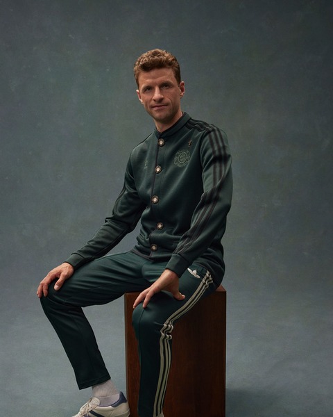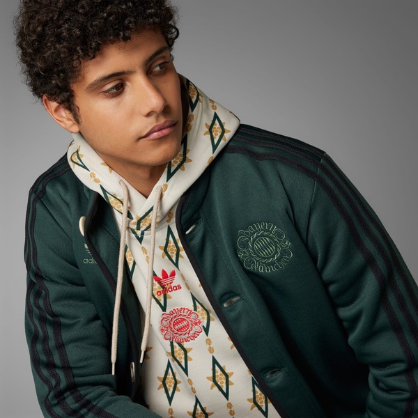 The collection also includes a tracksuit set with a dark green colour reminiscent of traditional Bavarian costumes. This jacket combines comfort and functionality, with a stand-up collar, zip pockets and the classic adidas 3-Stripes.