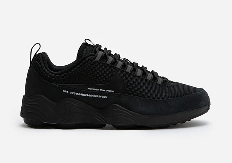 NAKED Copenhagen has unveiled the official product images of the Fragment Design x Nike Air Zoom Spiridon - and provided a surprise. In addition to the already known white version, a black colourway is also expected. The Fragment Design x Nike Air Zoom Spiridon ‘Black’ comes with an all-black base, black overlays and a matching black sole. Typical Fragment details such as contrasting white lettering on the sides add subtle but striking accents.