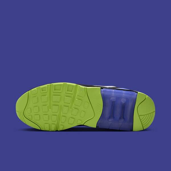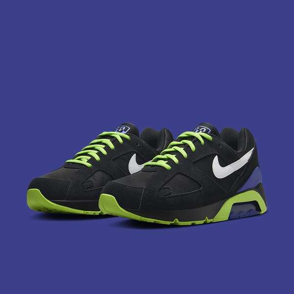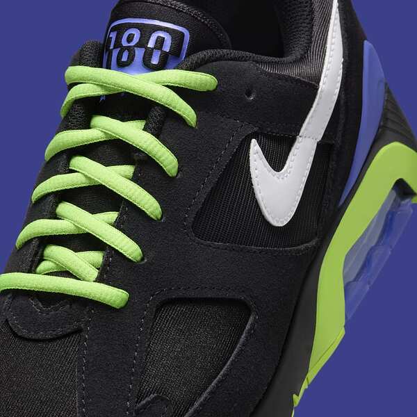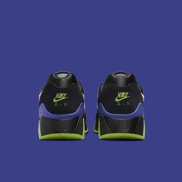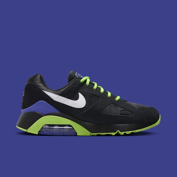 TLDR: Nike brings back the Air Max 180 in 2024 in an eye-catching ‘Joker’ colourway. Inspired by the bright colours of the legendary villain, this sneaker combines black mesh, suede overlays, action green accents and purple details. Available for €150 at Nike and selected retailers.