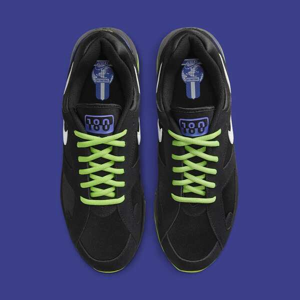 The shoe has a black mesh base with premium suede overlays that give it a retro-meets-modern look. A clean white leather swoosh contrasts with the upper, while the most eye-catching details are a vibrant action green colour. The laces, branding on the heel and outsole reflect the Joker's signature green hair, while dark purple accents on the tongue, heel and visible Air element complete the villain's look.
