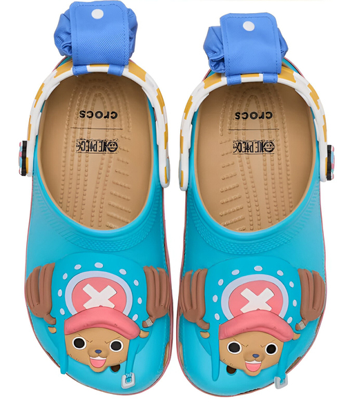 The Thousand Sunny Classic Clog features prints depicting the hull of the ship. There is a 3D rudder element on the heel, plus a movable sail Jibbitz™ charm. The Chopper Classic Clog features Chopper's face prominently on the upper and has playful details such as a small blue bag on the strap.