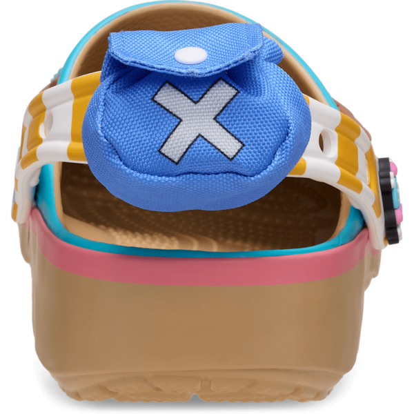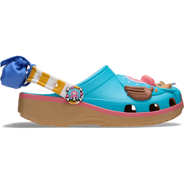 The Thousand Sunny Classic Clog features prints depicting the hull of the ship. There is a 3D rudder element on the heel, plus a movable sail Jibbitz™ charm. The Chopper Classic Clog features Chopper's face prominently on the upper and has playful details such as a small blue bag on the strap.