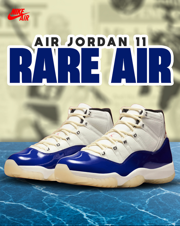 TLDR: The Air Jordan 11 ‘Rare Air’ will be released on 1 October for € 220 and features a striking colourway concept with vintage vibes. With patent leather in ‘Deep Royal Blue’, white leather overlays and red details, the model is part of the exclusive ‘Rare Air’ series. It is the latest addition to Jordan Brand's ‘Rare Air’ range, which already includes the AJ3 and AJ4. Inspired by old sample pairs, this release combines classic design elements with modern execution.