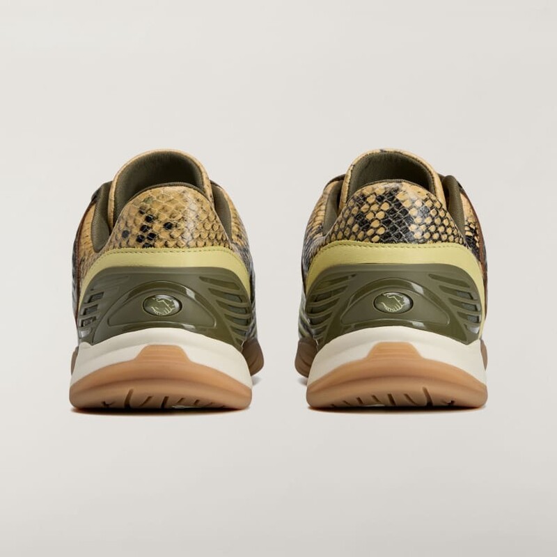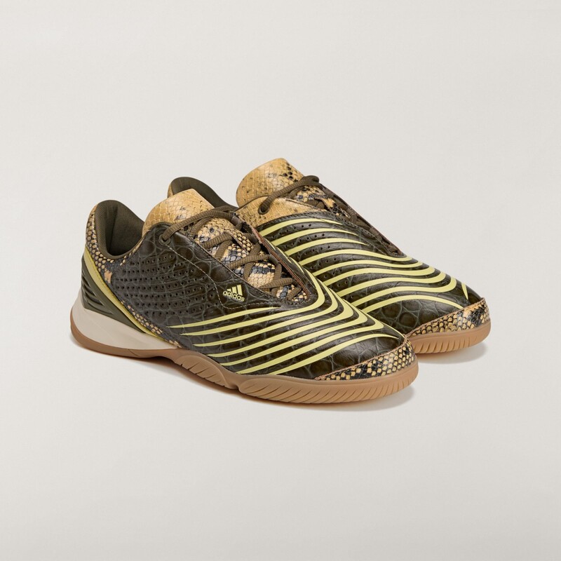 The F50 Sala is even more unusual. Here, Slam Jam experiments with materials and textures: one version features a gold metallic upper with a wavy cage design, while the other impresses with a wild mix of reptile textures in beige, brown and tan. Bright yellow accents on the upper create a strong contrast and make the shoe a real eye-catcher.